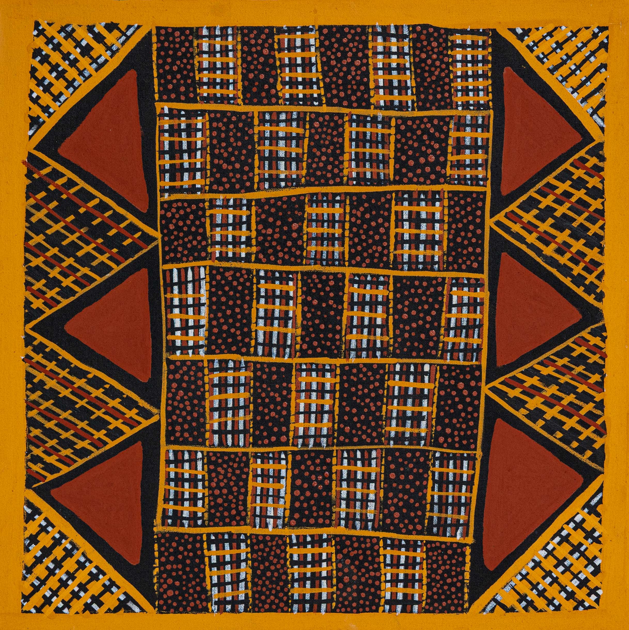 Pumpuni jilamara is how the artist refers to all ‘good’ paintings. The origins of the imagery lie in the Tiwi traditions of yirrinkiripwoja (decorative bodypainting) and the Pukumani ceremonial designs. All paintings are done in natural ochre collected locally on Melville Island.