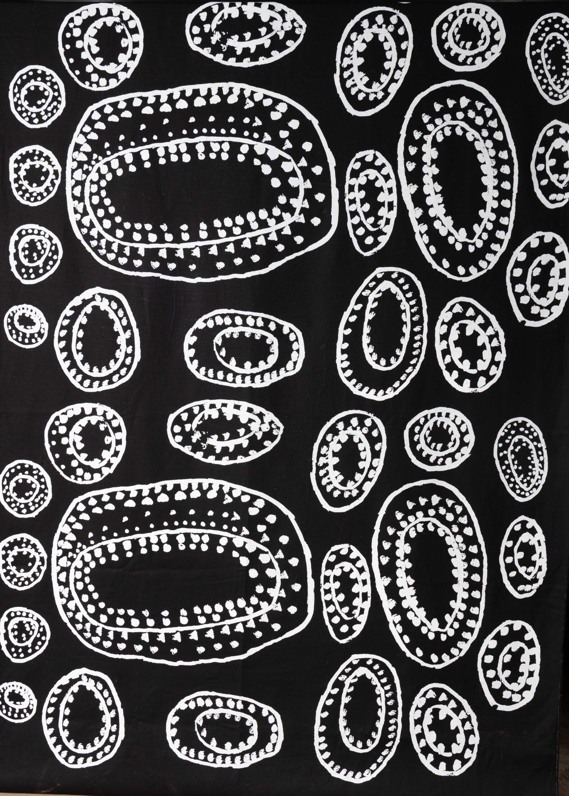 The sun is very important to the Tiwi people. Parlingarri (long time ago) it is believed that the whole world was in perpetual darkness and inhabited by yamparriparri (evil spirits). The wulimaka (old lady) Murtankala came up from underground with three children in a tunga (bark bag) on her back. As she moved around on the surface, she created grooves and crevices in the land with her body. Some of these filled with water and created the geographical shapes and channels of the Tiwi Islands. She made yikwani (fire) by rubbing grass and sticks together and lifted it up into the sky with her two hands to create light for her children, one of whom was Purukuparli (the first Tiwi man). This light became warnarringa (the sun). To this day contemporary Jilamara artists still use locally sourced earth pigments from Country to paint. The yellow ochre is burnt on the fire to make the red pigment – the colours of the land, the sun and fire applied to recall the old designs and creations stories of the Tiwi people.