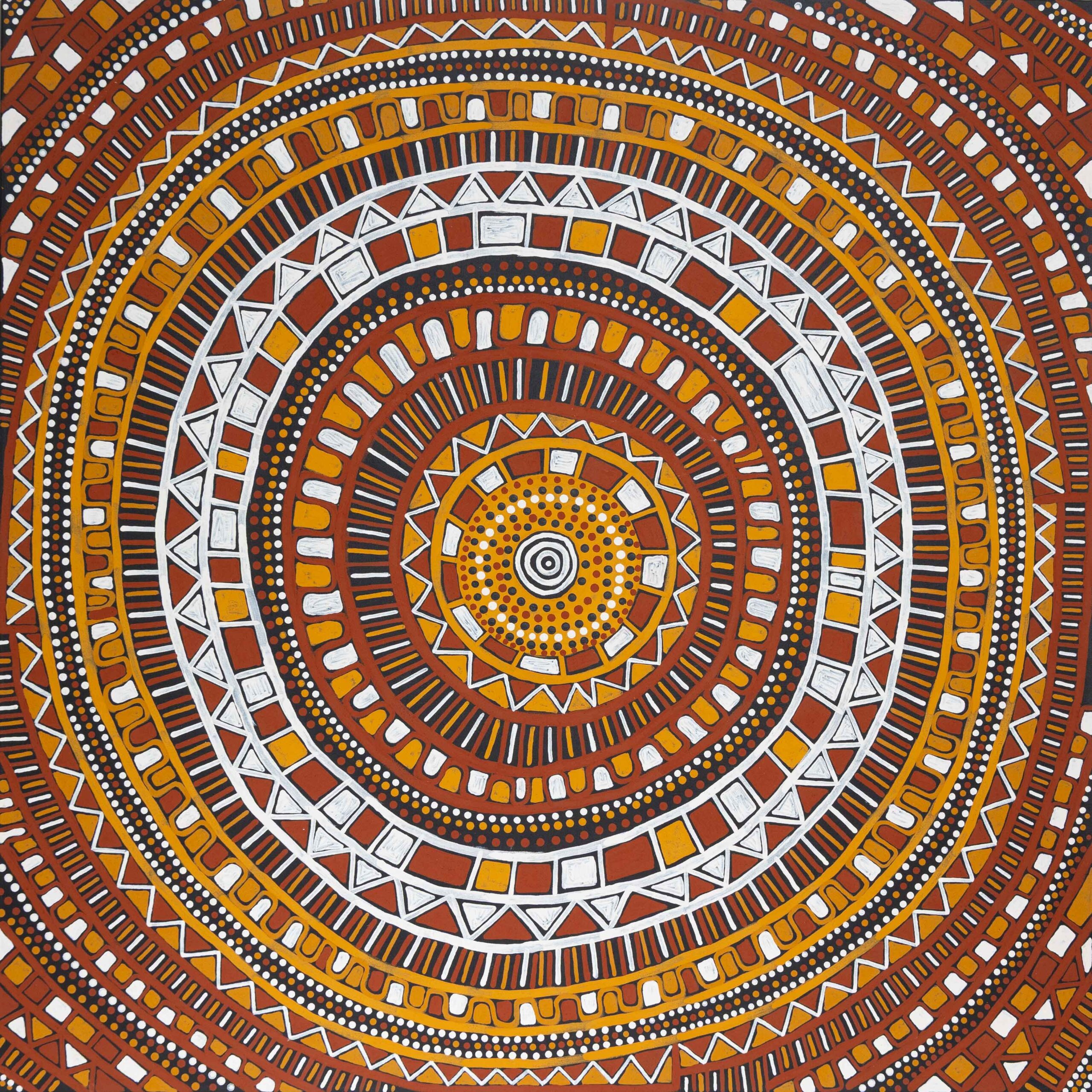 `Kurlama is the Tiwi coming-of-age ceremony which coincides with the harvest of kurlama, wild yam. The ceremony is performed late in the wet season when a ring or halo appears around Japarra (the moon). Elders of both sexes sing and call out to the ancestors for three days, welcoming children into adulthood. The ceremony is held on a prepared ground of concentric circles at the centre of which round yams are prepared for eating. Circular motifs in Tiwi art often symbolise the moon, yam and ritual circles of the Kurlama ceremony, the pwanga (dots) reflect the japalinga (stars).’ Will Heathcote