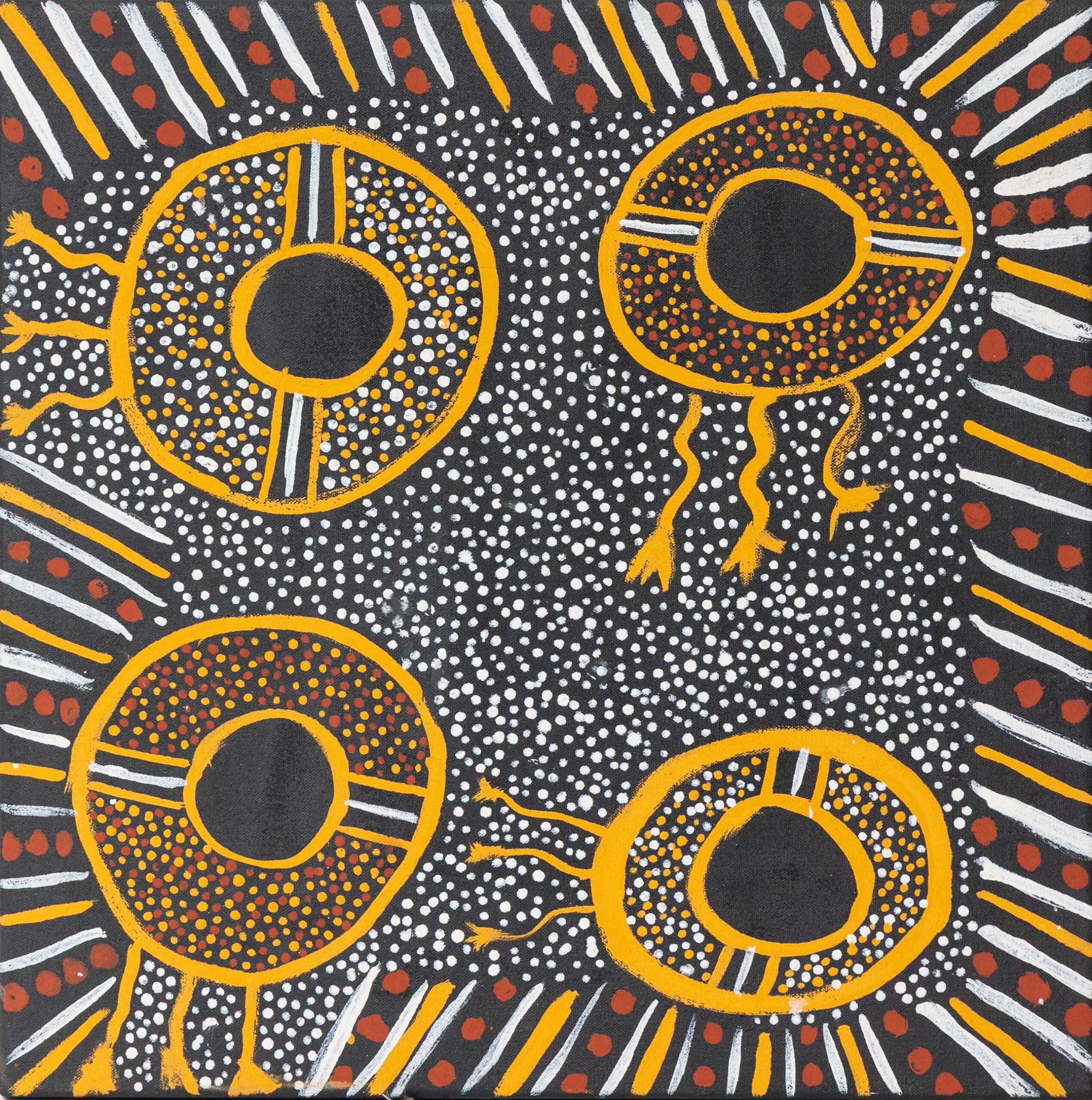 Pamijini are ceremonial armbands used in Pukumani ceremony. They are woven with pandanus, often dyed with natural colourings. Feathers and seeds are often used to decorate the armbands.