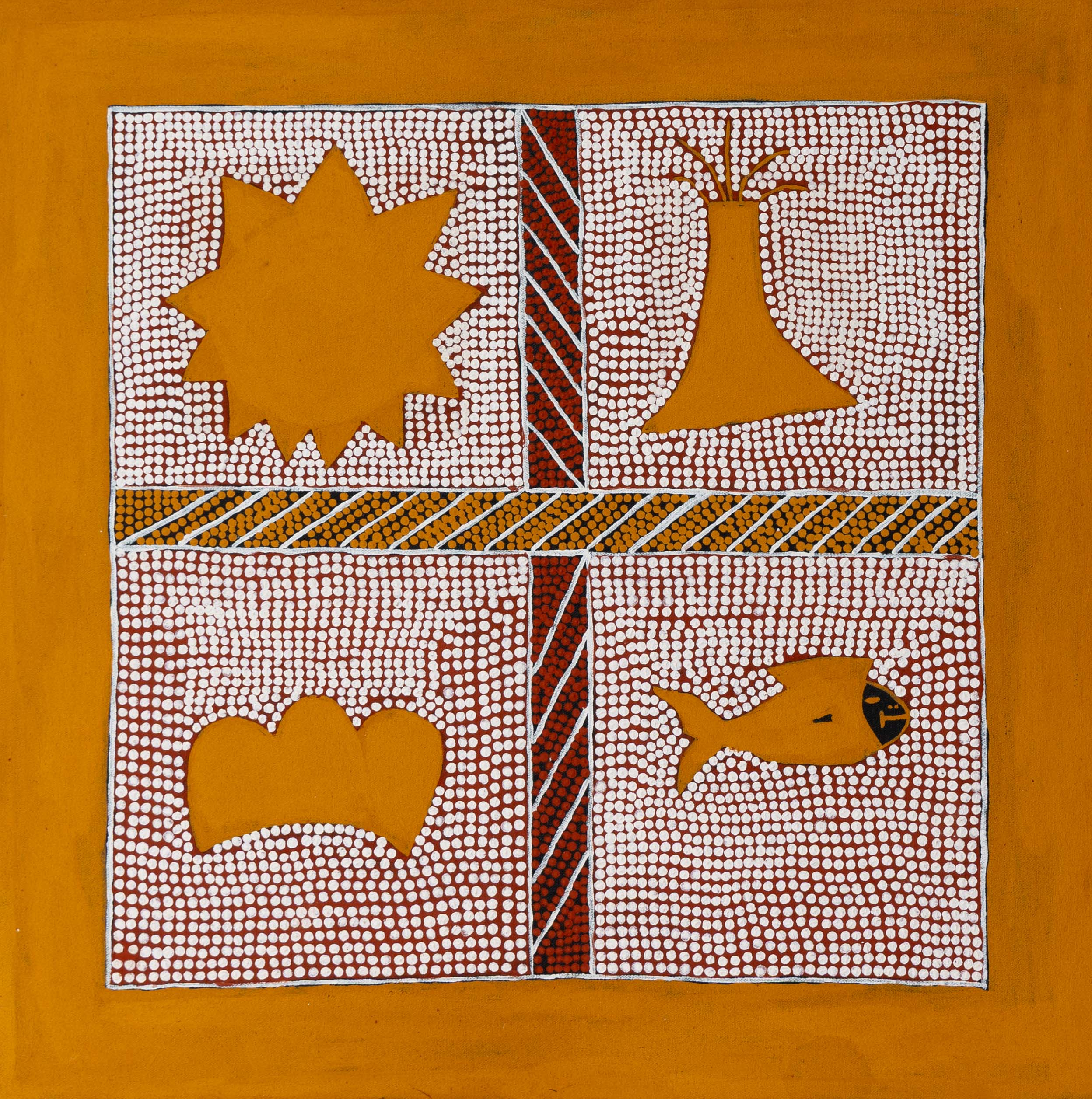 The Tiwi people are made up of four main tribes of which there are also subgroups: Sun, Stone, Scally Mullet and Pandanus. A person inherits their Yiminga from their mother’s side of the family, while they inherit their Country and totem from their father’s family. Yurrima is your father’s and paternal grandmothers Yiminga.