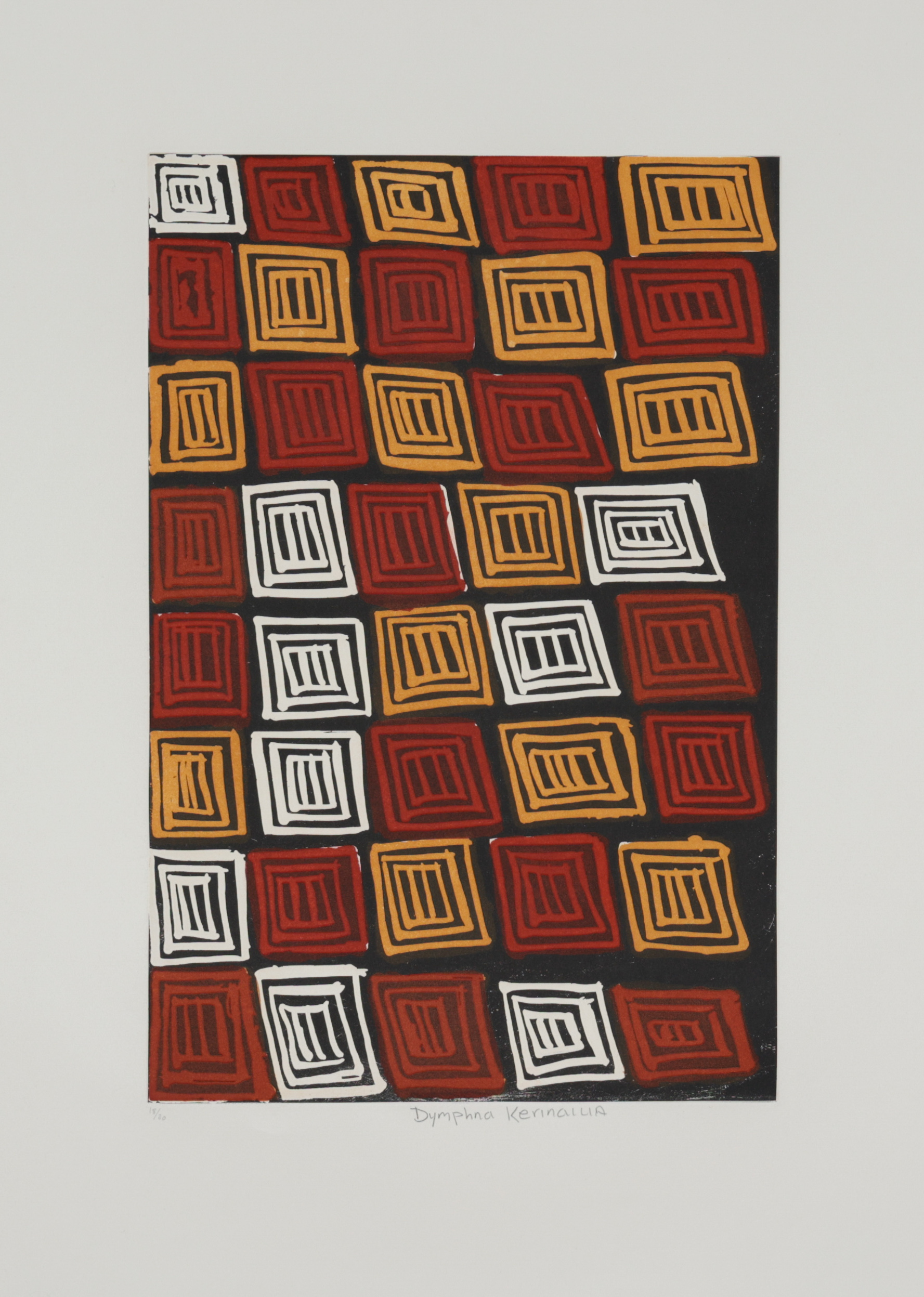 Ngiya Jilamara means my design. All jilamara (design) is originally drawn from the body painting which accompanied the pukumani (funeral) and kulama (initiation/yam) ceremonies. Sugar lift and aquatint etching, printed in three colours from three plates. Created during a workshop at Northern Editions in November 2005 with printmakers Dian Darmansjah and Leon Stainer, editioned in 2006